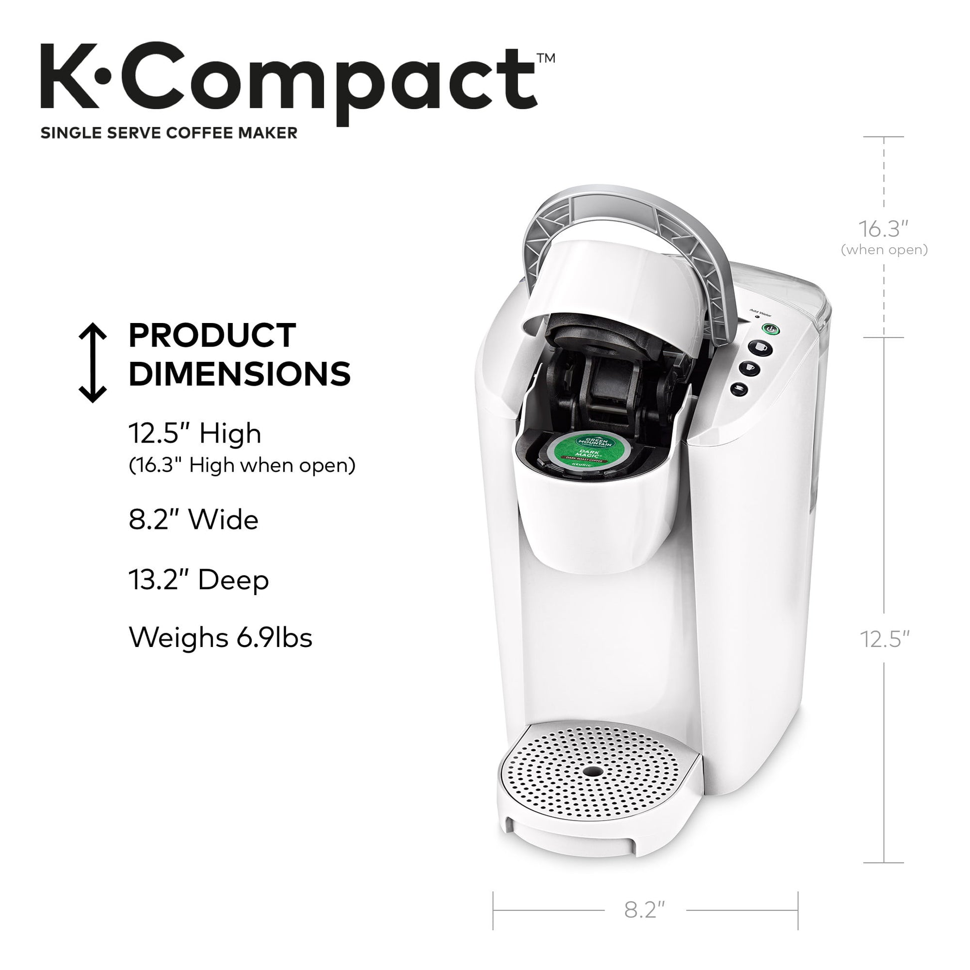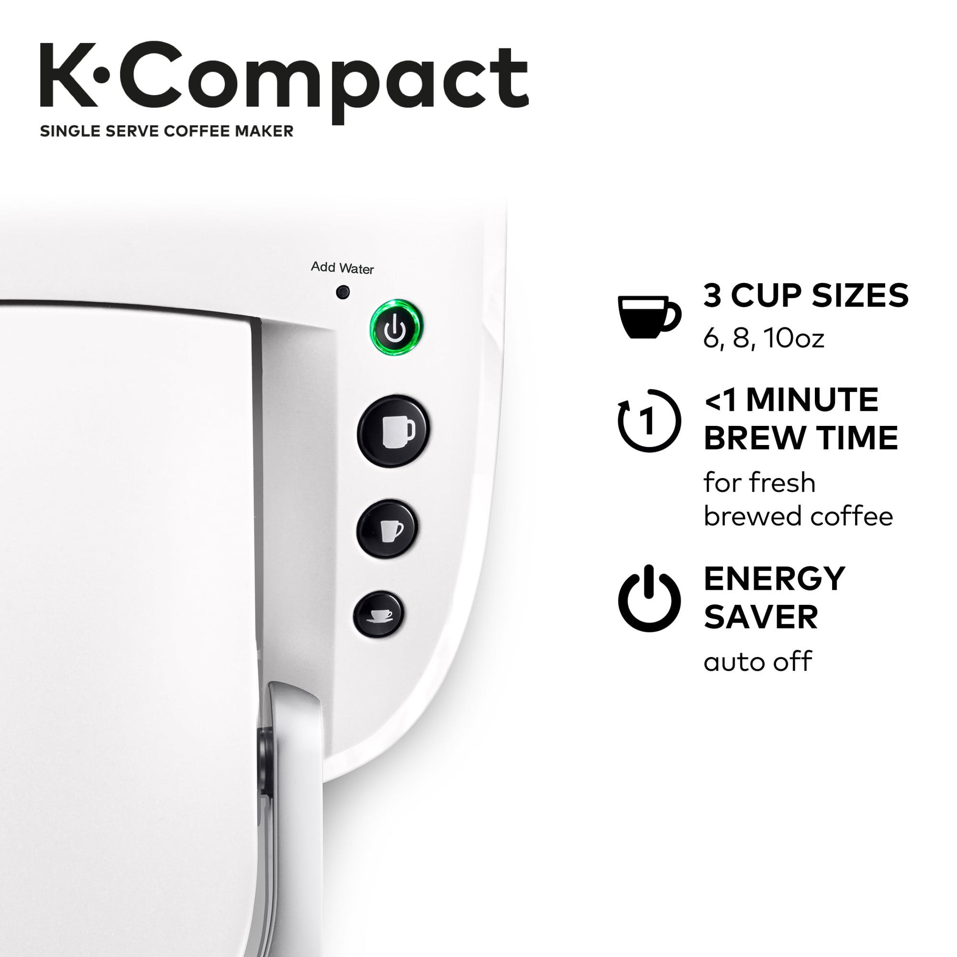Space saving. Crowd-pleasing. The slender and stylish Keurig K-Compact single serve coffee maker offers consumers a space-saving design to fit their countertop, but still delivers the delicious taste and unparalleled convenience that the Keurig brand is known for. Designed to leave the smallest footprint possible, the Keurig K-Compact brewer in Moonlight Gray is just over 8 inches wide, leaving you plenty of space on your countertop without sacrificing a thing. Brew 6, 8, or 10 oz. of your favorite beverages in under a minute. Choose from hundreds of delicious K-Cup pod varieties coffee, tea, hot cocoa, iced beverages, and more and enjoy a perfect cup, every time. Or brew your own ground coffee with the Keurig Universal My K-Cup Reusable Coffee Filter (not included). The Smart Start feature heats and then brews in one simple process for even more convenience. The K-Compact brewer has a removable drip tray to accommodate travel mugs, and its 36 oz. removable water reservoir allows you to brew multiple cups before refilling. *- BREWS MULTIPLE CUP SIZES: (6, 8, 10 oz.). Enjoy the most popular cup sizes. Use the 6 oz. cup size to achieve the strongest brew. *- COFFEE IN NO TIME: Brews K-Cup pods in under a minute. *- A COMPACT MULTI-CUP RESERVOIR: 36 oz. removable water reservoir make refilling easy. *- SMART START: Your coffee maker heats then brews in one simple process. No need to wait for it to heat before selecting your cup size. *- SIMPLE BUTTON CONTROLS: Just insert a pod, select your desired cup brew size, and brew a great-tasting cup in under a minute. *- ENERGY EFFICIENT: Auto off feature turns the coffee maker off 2 hours after your last brew, helping to save energy. *- REMOVABLE DRIP TRAY: Removable drip tray accommodates travel mugs up to 7.0 inches tall, and holds a full accidental brew for easy cleanup. *- DISPENSE HOT WATER: Open and close the brewer handle (without a pod) and select your cup size for hot water on demand.