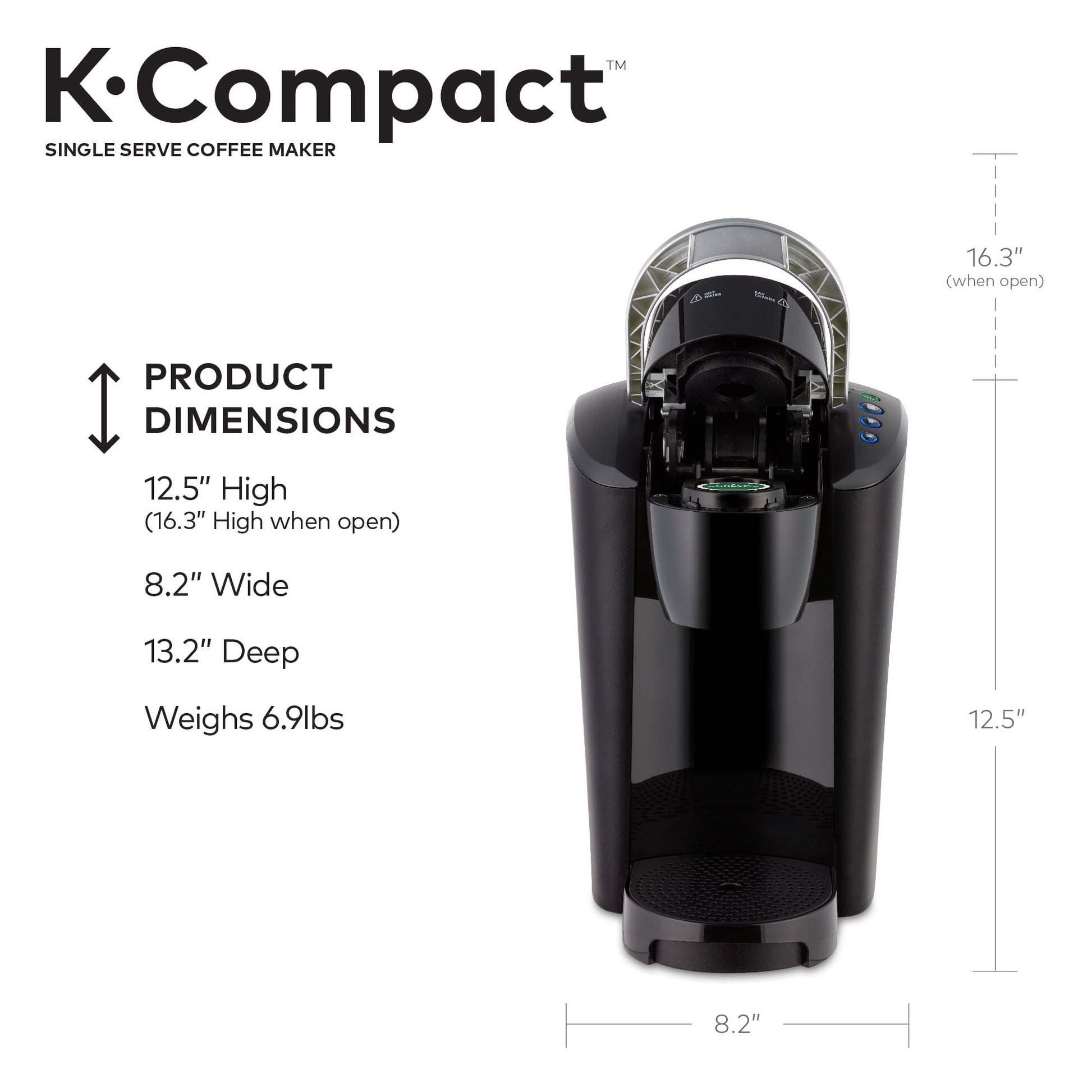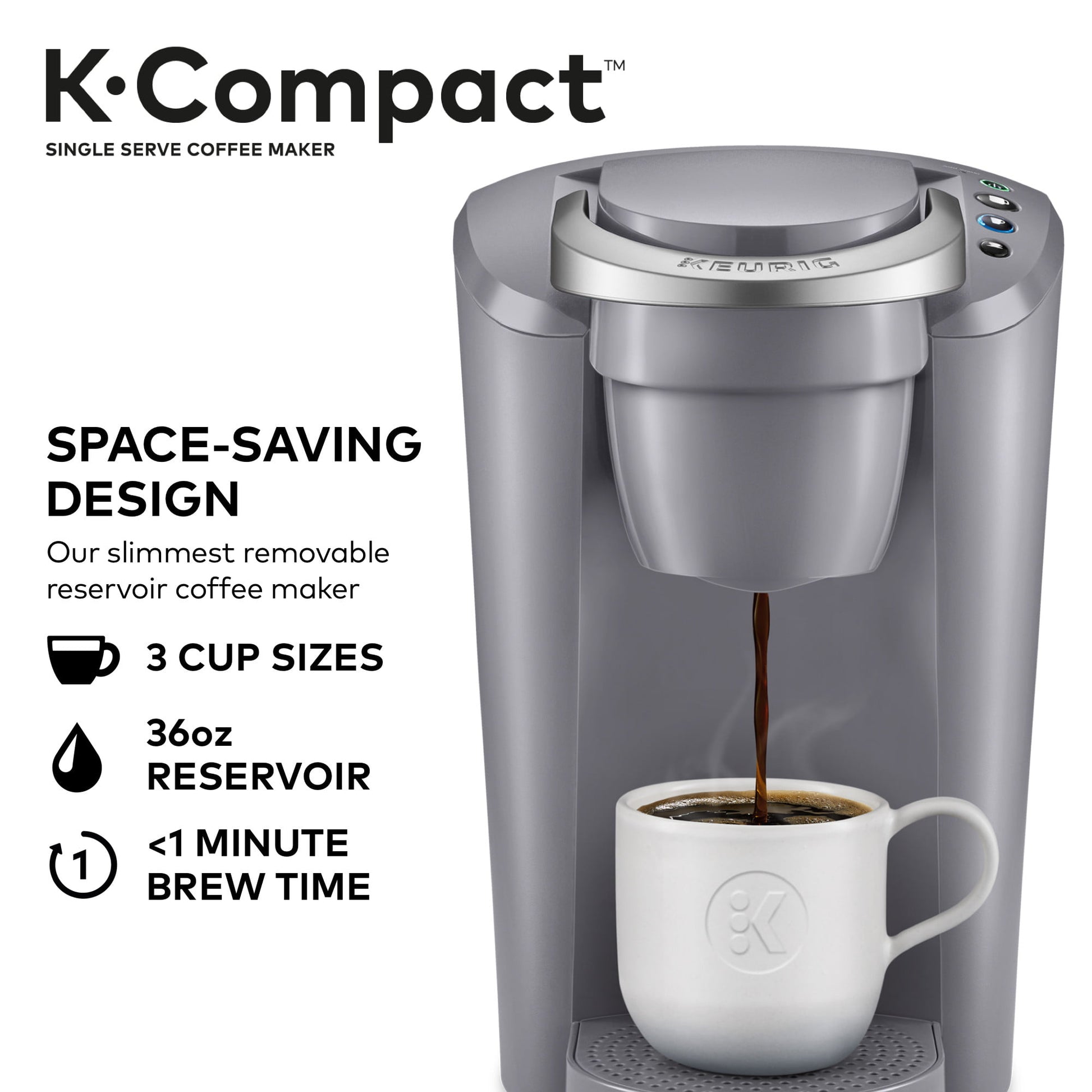 Space saving. Crowd-pleasing. The slender and stylish Keurig K-Compact single serve coffee maker offers consumers a space-saving design to fit their countertop, but still delivers the delicious taste and unparalleled convenience that the Keurig brand is known for. Designed to leave the smallest footprint possible, the Keurig K-Compact brewer in Moonlight Gray is just over 8 inches wide, leaving you plenty of space on your countertop without sacrificing a thing. Brew 6, 8, or 10 oz. of your favorite beverages in under a minute. Choose from hundreds of delicious K-Cup pod varieties coffee, tea, hot cocoa, iced beverages, and more and enjoy a perfect cup, every time. Or brew your own ground coffee with the Keurig Universal My K-Cup Reusable Coffee Filter (not included). The Smart Start feature heats and then brews in one simple process for even more convenience. The K-Compact brewer has a removable drip tray to accommodate travel mugs, and its 36 oz. removable water reservoir allows you to brew multiple cups before refilling. *- BREWS MULTIPLE CUP SIZES: (6, 8, 10 oz.). Enjoy the most popular cup sizes. Use the 6 oz. cup size to achieve the strongest brew. *- COFFEE IN NO TIME: Brews K-Cup pods in under a minute. *- A COMPACT MULTI-CUP RESERVOIR: 36 oz. removable water reservoir make refilling easy. *- SMART START: Your coffee maker heats then brews in one simple process. No need to wait for it to heat before selecting your cup size. *- SIMPLE BUTTON CONTROLS: Just insert a pod, select your desired cup brew size, and brew a great-tasting cup in under a minute. *- ENERGY EFFICIENT: Auto off feature turns the coffee maker off 2 hours after your last brew, helping to save energy. *- REMOVABLE DRIP TRAY: Removable drip tray accommodates travel mugs up to 7.0 inches tall, and holds a full accidental brew for easy cleanup. *- DISPENSE HOT WATER: Open and close the brewer handle (without a pod) and select your cup size for hot water on demand.