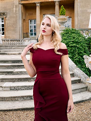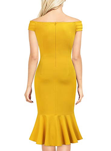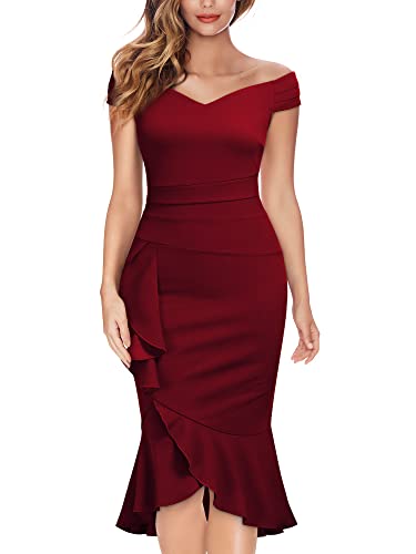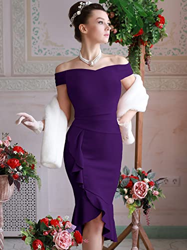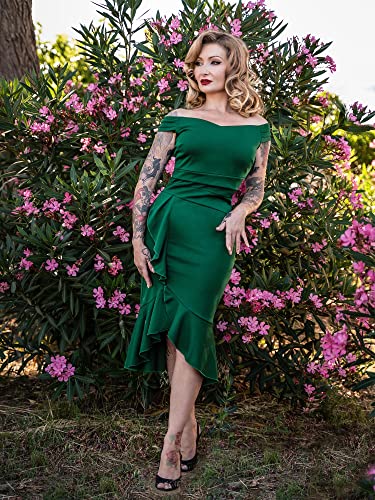 Knitee Women's Off Shoulder V-Neck Ruffle Pleat Waist Bodycon Evening Cocktail Slit Formal Dress (Dark Green, Small)
