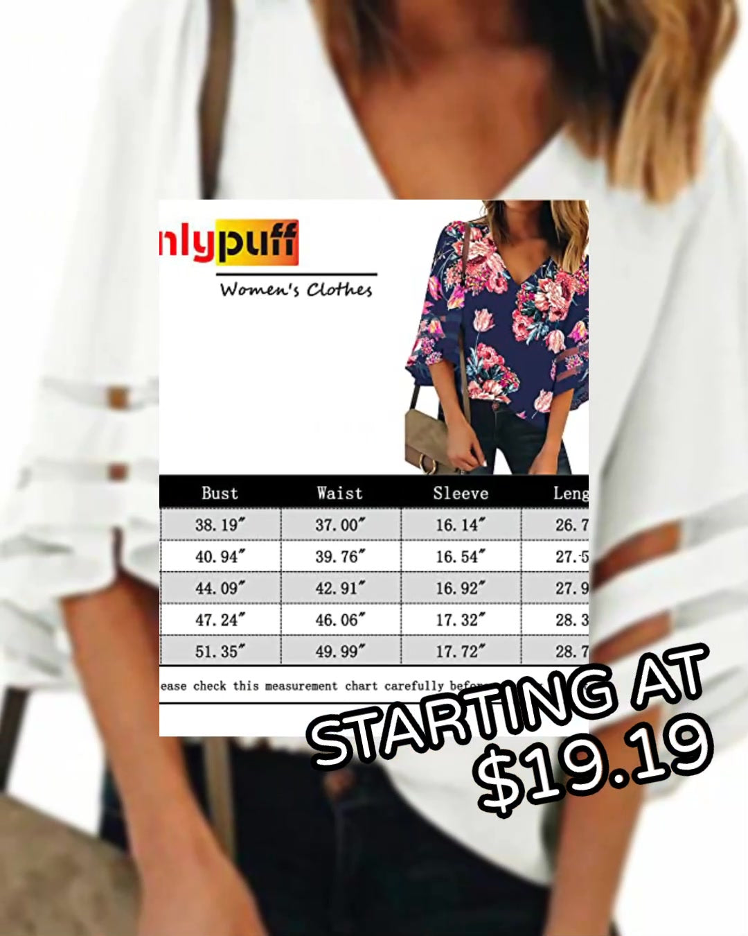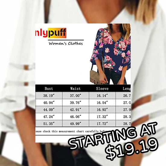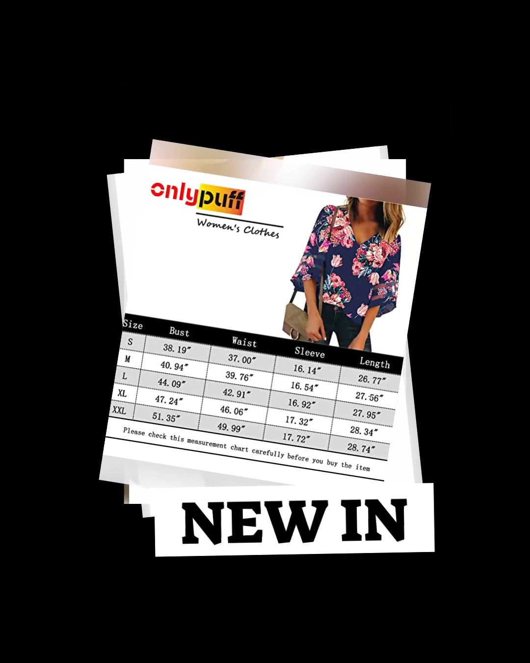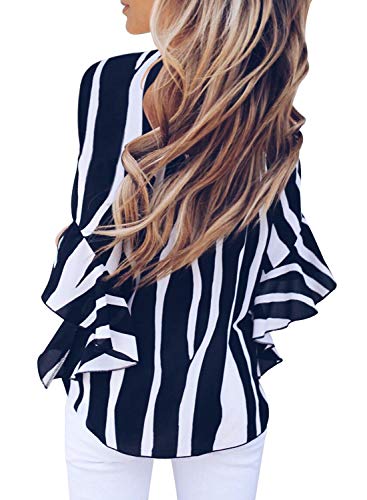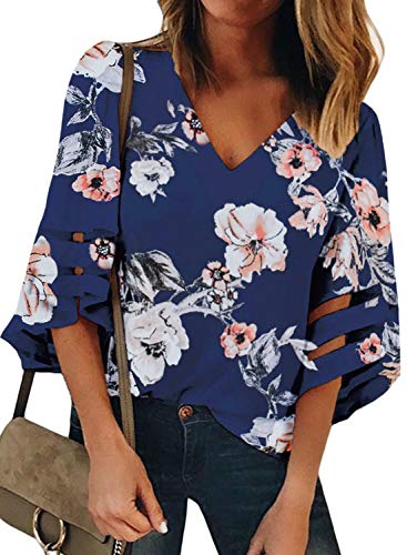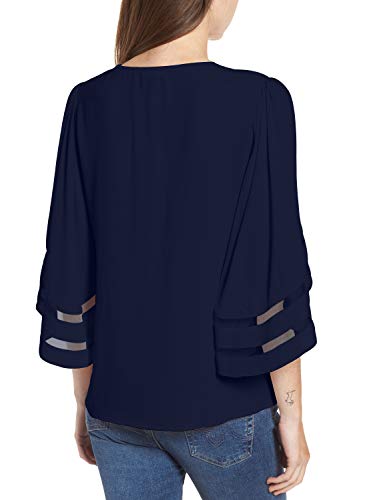 onlypuff Women Solid Color V Neck 3/4 Bell Sleeves Blouses Shirt Tunic Tops DarkBlue M