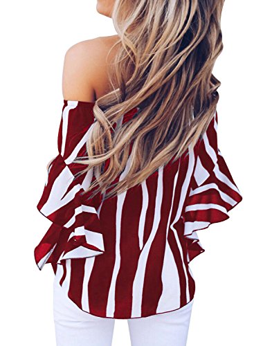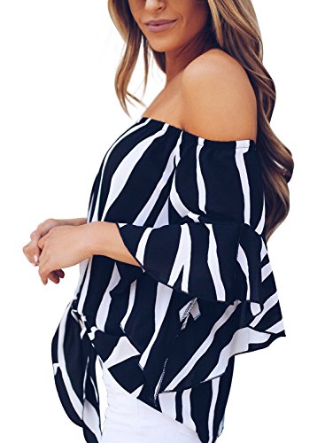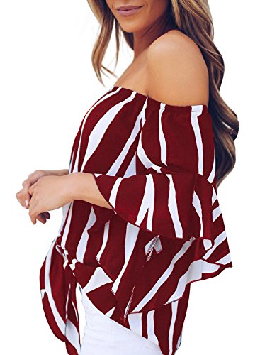 - Feature: Off shoulder, Bell sleeve, 3/4 sleeve, Vertical striped, Front tie knot