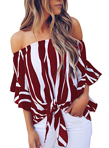- Striped off the shoulder blouses with tie knot front,meet your fashion taste!
