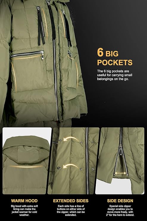 - KINDLY BE NOTED: The warm down coat will be folded and compacted inside of the package when delivery, so you may feel it thin and flat, if so, lightly pat the jacket with your hands and then have it hang.