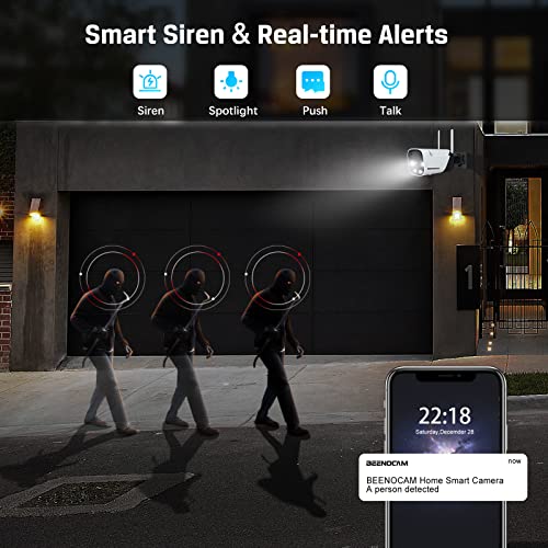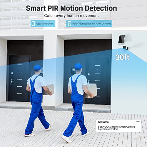 🌞【100% Wireless&Solar Powered】BEENOCAM outdoor security camera built-in 15000mAh large capacity rechargeable batteries, combo with self-power solar panel, providing you 365 days non-stop power supply. It's 100% wire-free, no power cord or network cable. The wireless cameras for home security can be installed almost anywhere,such as a shop,home,garage,yard,outdoor/indoor. Eco-friendly and money-saving! - 🏃【PIR Motion Detection&Real-time Alert】 With built-in human-AI technology, Security cameras wireless outdoor greatly improve human detection ability, reducing false alarms from insects and branches. Camera surveillance exterieur will send real-time alerts to your phone once any suspicious motion events detected, trigger loud siren, spotlight, or sound effects to frighten away unwanted visitors, protecting your family and property.