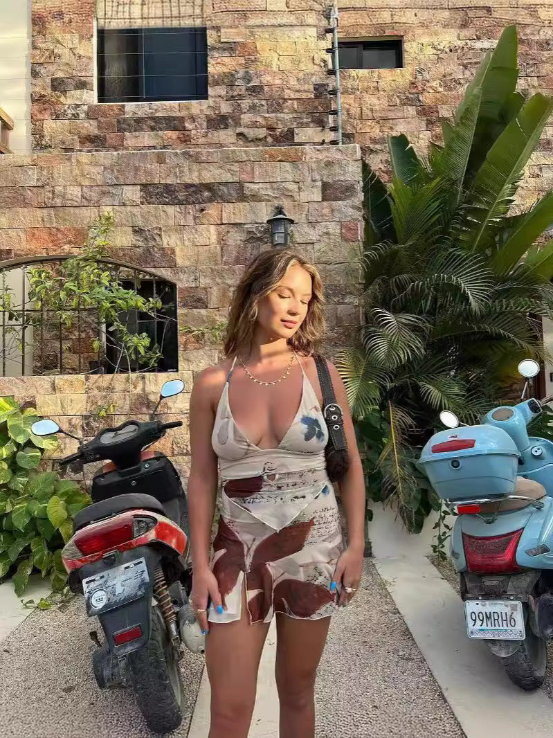This 2-piece summer suit features a sexy v-neck halter top and a pleated short skirt, creating a stylish and flirty look. The lightweight fabric is perfect for warmer weather, making it a comfortable and fashionable option for any summer occasion. Perfect for those who want to make a statement with their style.