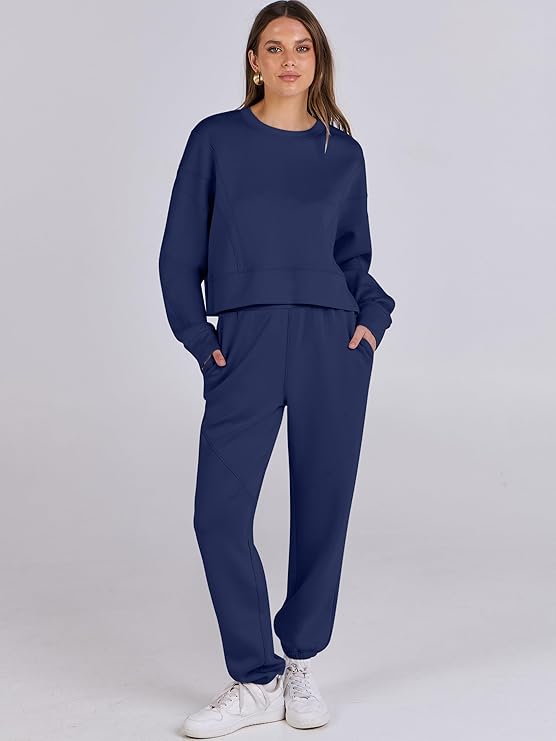 - Women's lounge active Sets, cropped, crew neckline, trend flattering seaming details, wide bottom band, cinch bottom, with pockets.This Sweatsuit set is perfect for both workouts and casual lounging. Create a comfortable and stylish outfit for home, or step out in fashion-forward athletic wear.