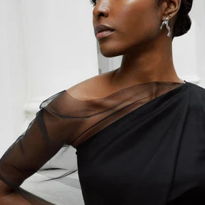We see glamour in your future. Inspired by our Zinnia Dress, our Zinnia Top brings the allure by marrying a fitted bodice in structured, mid-stretch European ponte with a soft European mesh layer floating over her neckline and one arm. Her asymmetrical one-shoulder silhouette underneath only makes Zinnia that much more of the perfect cocktail piece.