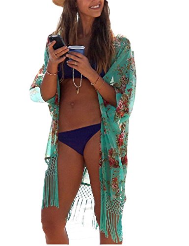 This Bsubseach Women's Blue Print Chiffon Bikini Swimsuit Cover Up is made with lightweight, semi-sheer fabric and a modern print. It features stylish tassel accents, a loose-fitting silhouette, and an open-front design for easy and comfortable wear. Perfect for your next beach getaway.