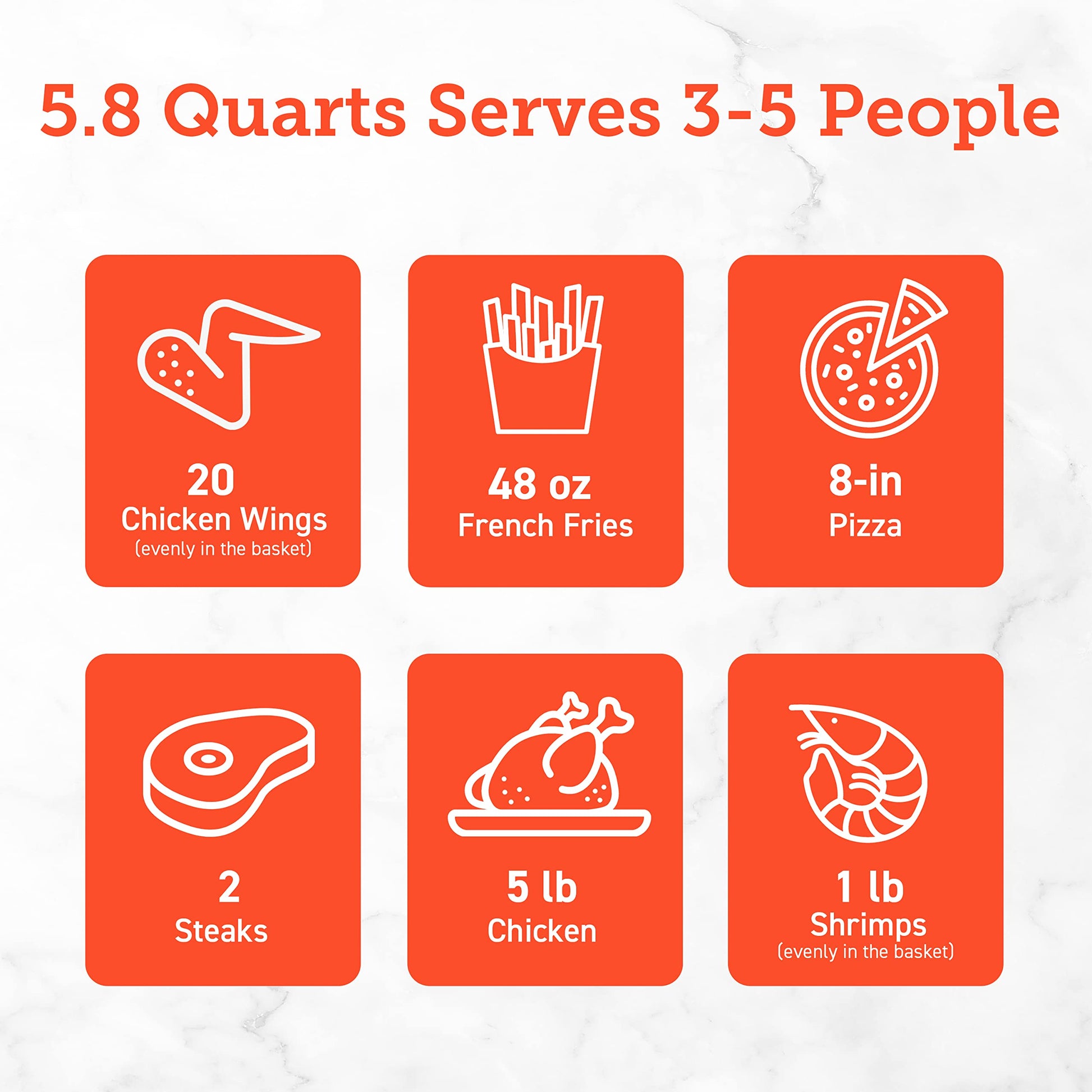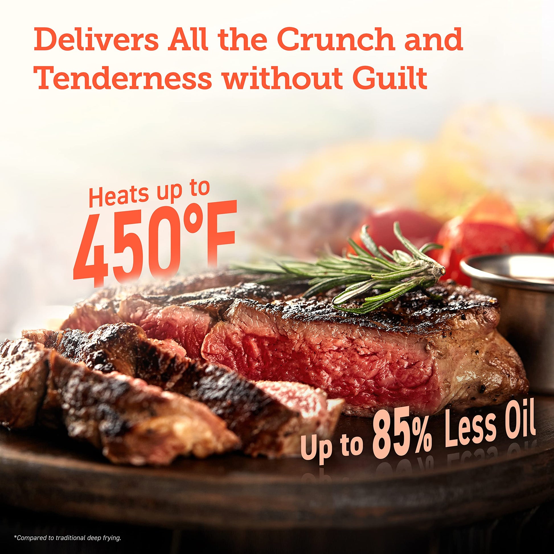 CUT DOWN 85% OIL :With 360° rapid heat circulation technology, feel free to enjoy the same crispy textures as traditional deep frying with up to 85% less fat - ENJOY MEALS IN MINUTES: This air fryer cooks with industry-leading temperatures up to 450°F, making heating efficiency 20% faster than before. Help you prepare a quick meal