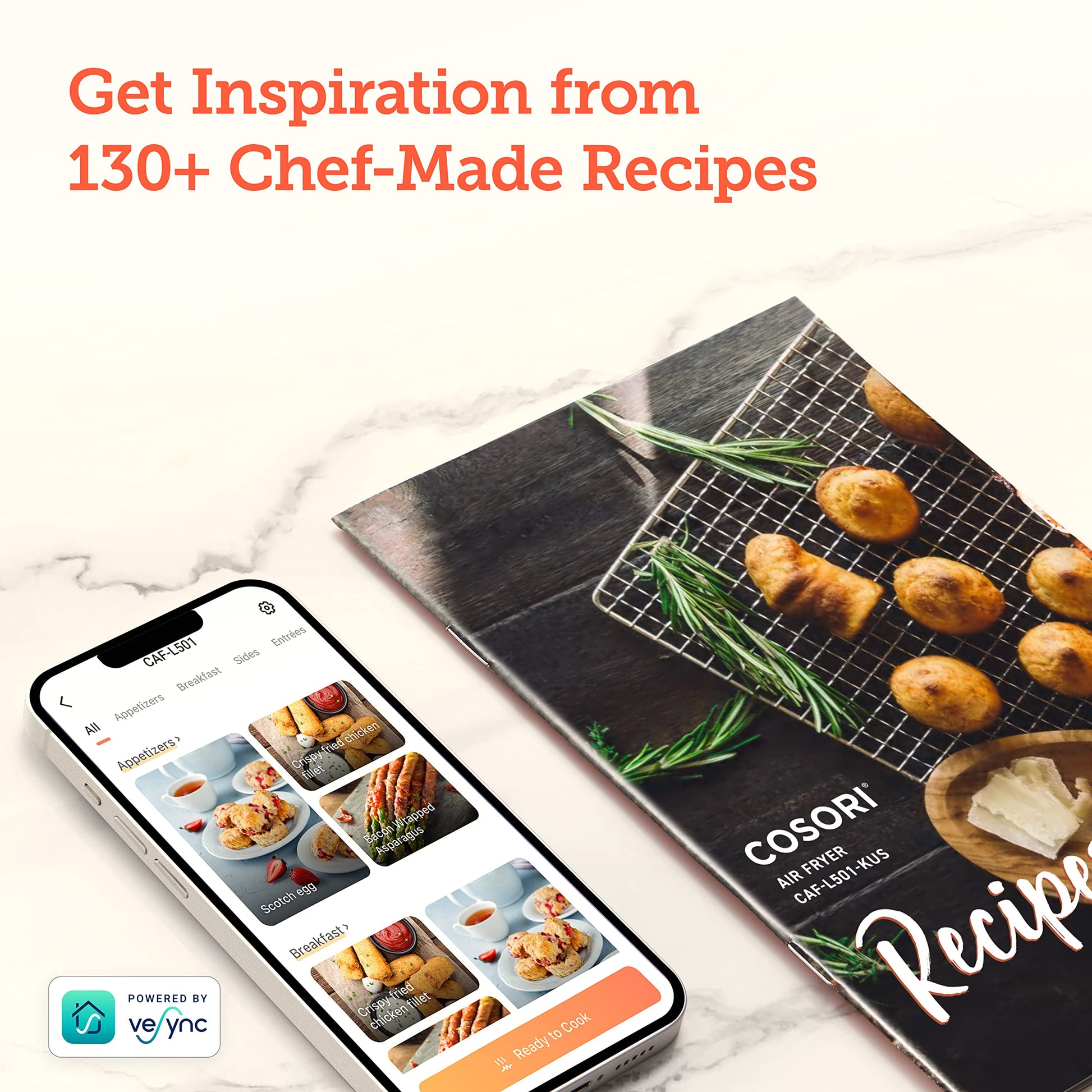 - COOKBOOK & ONLINE RECIPES : Always be inspired to cook with an included cookbook of 30 original recipes by Cosori R&D chefs and 100+ recipes on the free VeSync app. You’ll be cooking like a pro in no time
