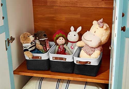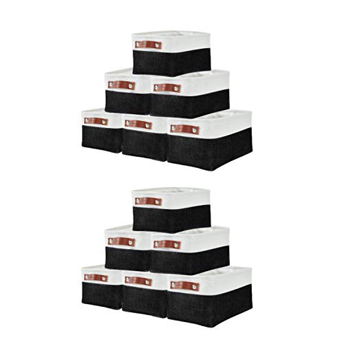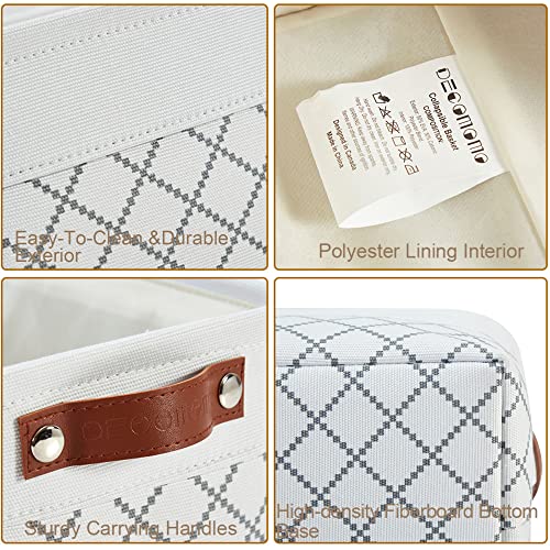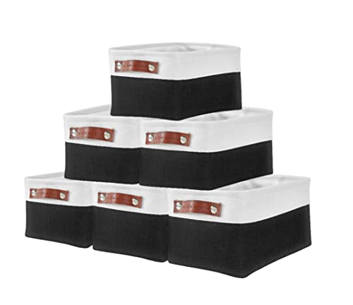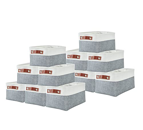 DECOMOMO Foldable Small Storage Bin | Rugged Canvas Fabric Basket Container W/ Leather Handles | Great for Organizing Closets, Offices, Nurseries and Homes (Grey and White, Small - 6 Pack)