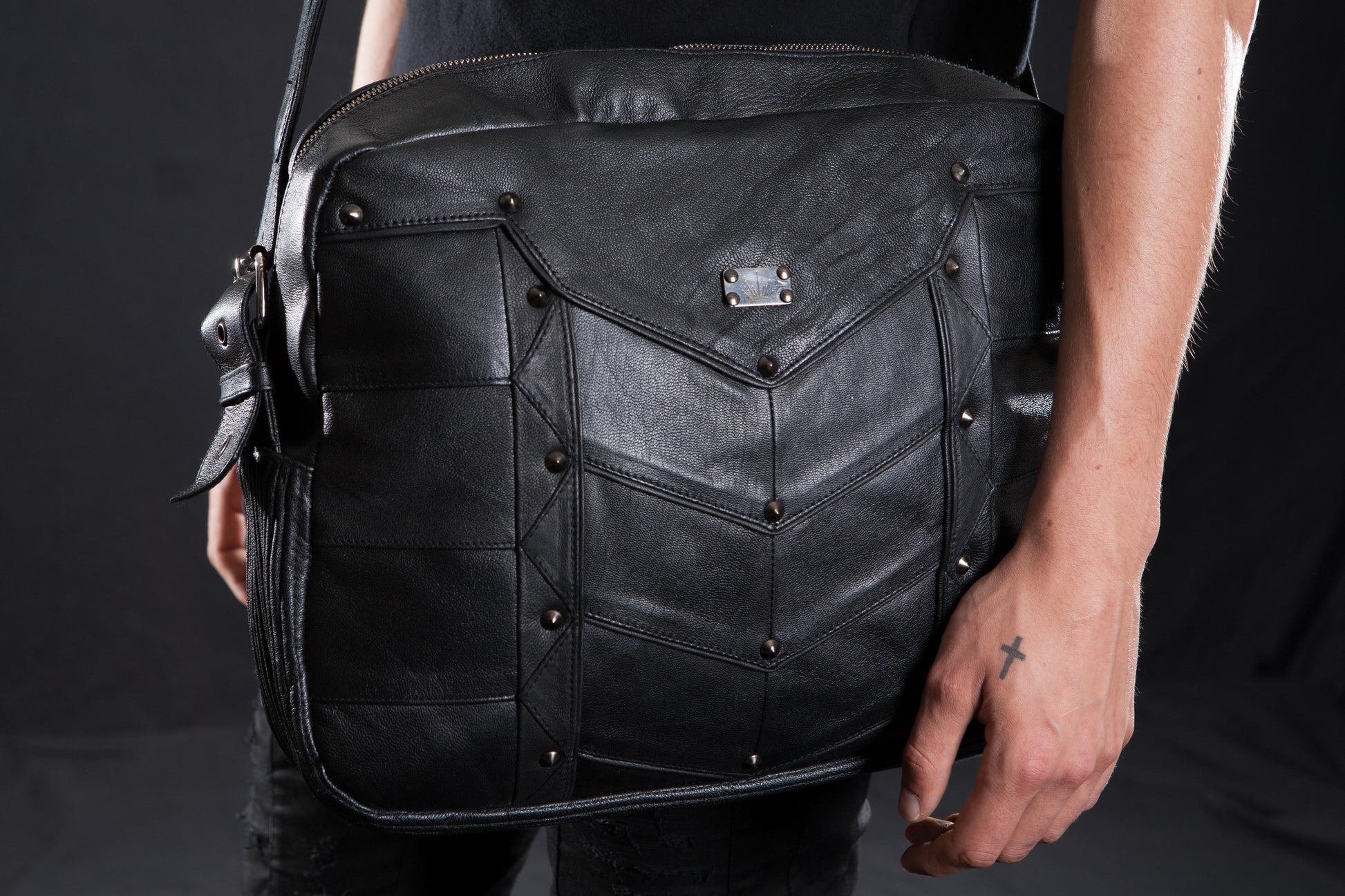 Cut from high-quality sheep leather. Large inside pocket with separate compartments. Custom hardware and an adjustable strap. It easily fits a 15-inch laptop with room to spare for all your cords and accessories.