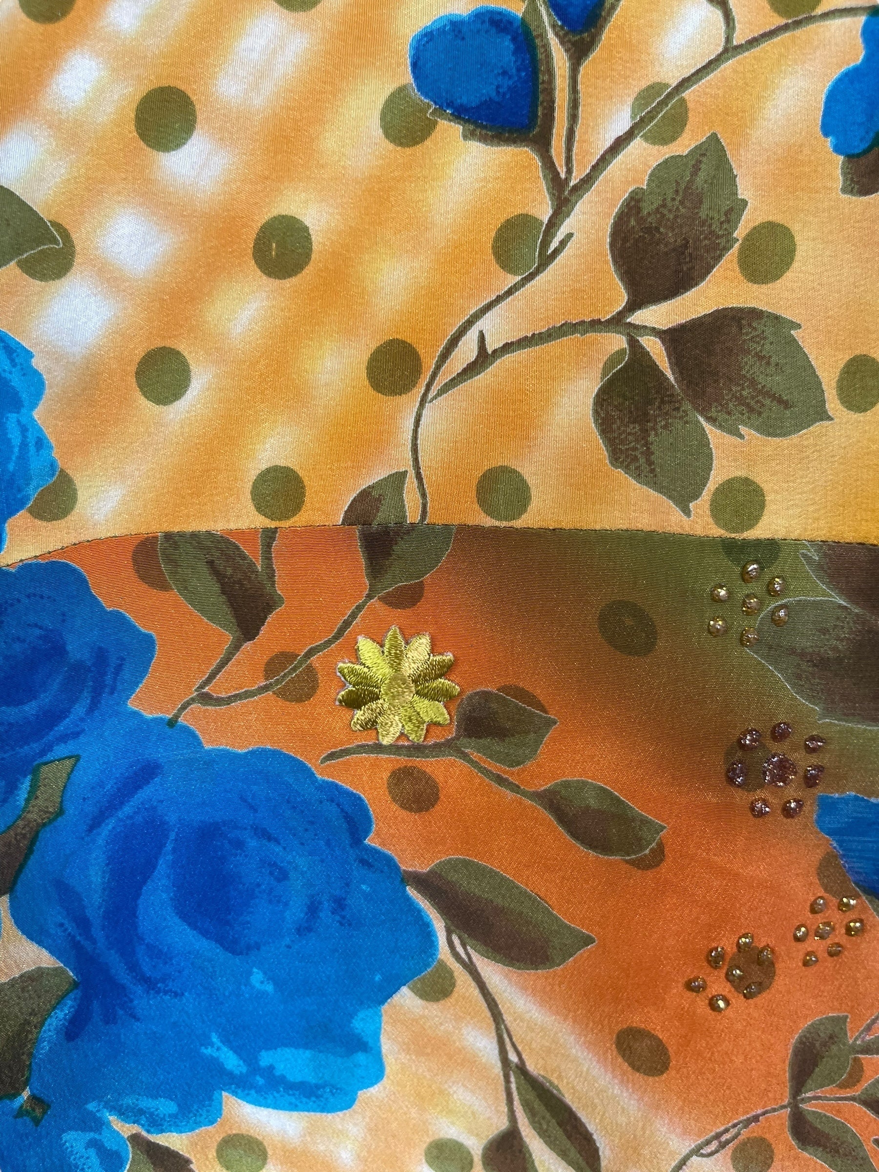 If you look very closely, you will see that the silks in this collection show some of the character of their previous incarnations through the appliqués that have been lovingly applied to bring new life to the fabric. This piece is a reminder that we are part of a collective journey to which we all add a little something.