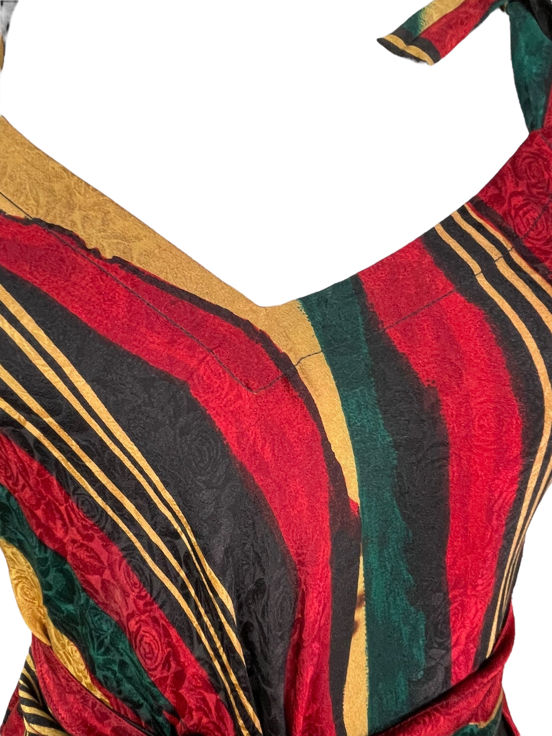 This dress is expertly made from 100% crepe silk, delivering optimal drape and comfort with its bias cut for a flawless fit. Its adjustable shoulder straps provide the perfect amount of coverage. Style this piece with any of its four different sides facing frontward for a variety of looks. Layer it over a t-shirt for added warmth or tie it halter-style for a more elegant look. See the sizing tab for exact measurements.