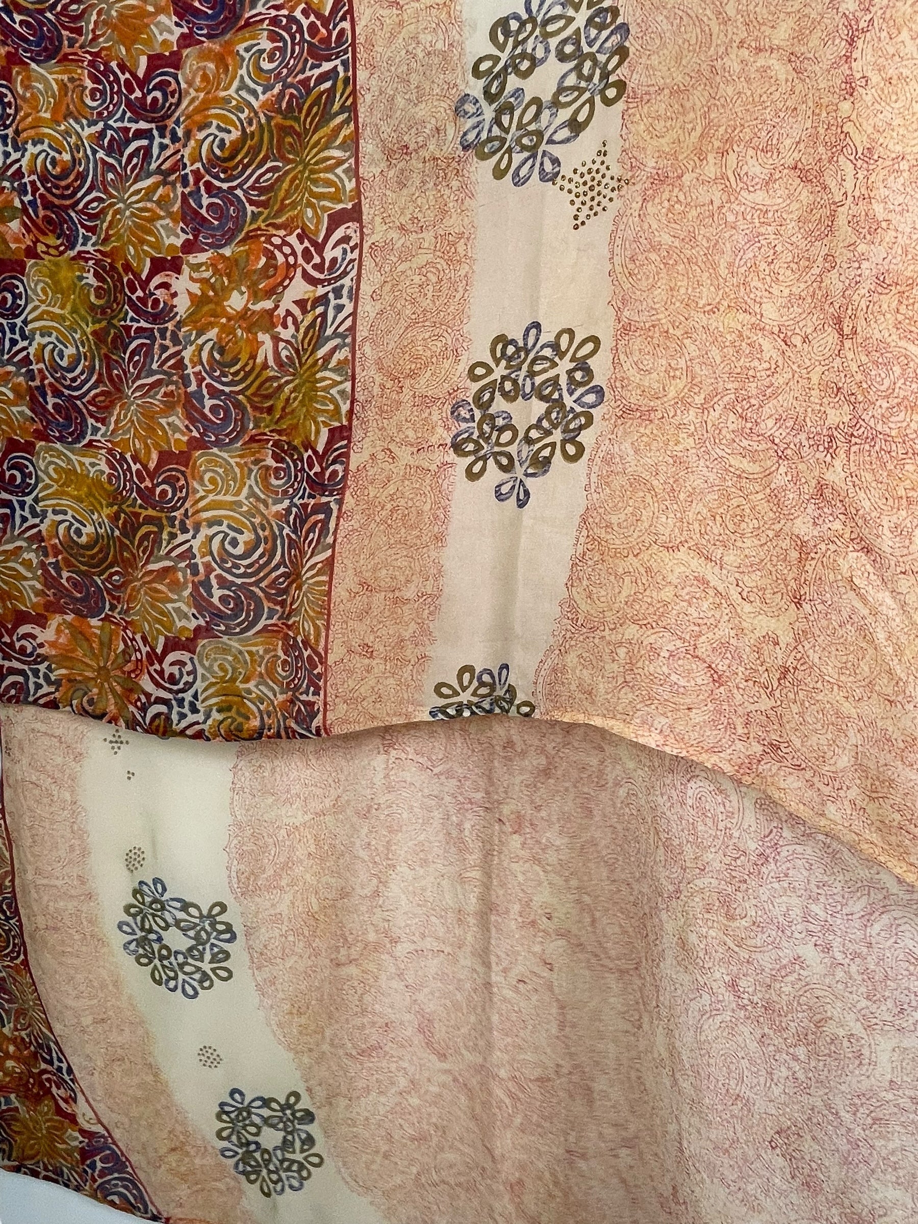 If you look very closely, you will see that the silks in this collection show some of the character of their previous incarnations through the appliqués that have been lovingly applied to bring new life to the fabric. This piece is a reminder that we are part of a collective journey to which we all add a little something.