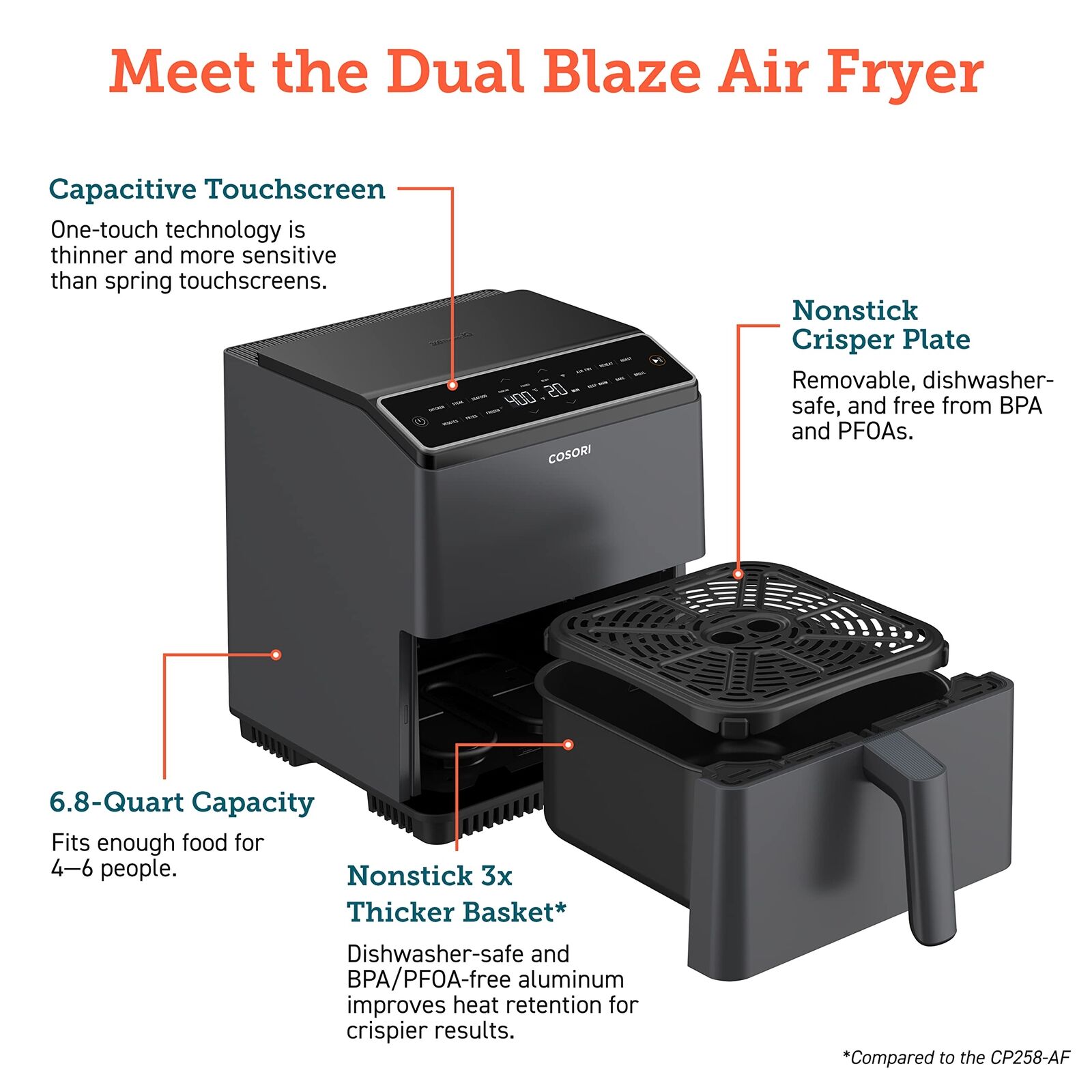 Enjoy perfectly cooked meals with the COSORI Air Fryer. This 9-in-1 appliance uses less oil than traditional air fryers to give you crunchy and delicious frying results, up to 450°F! Easily make meals with the 30 exclusive recipes and non-stick basket. Plus, it's quiet, compact, and dishwasher-safe.