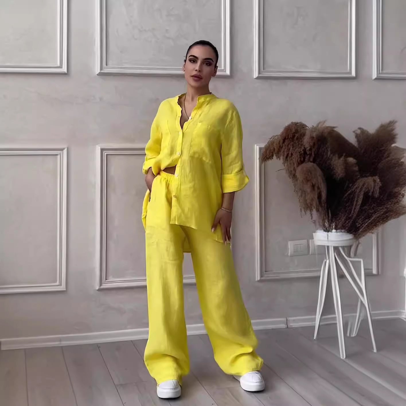 Enhance your casual wardrobe with the Women's New Stand Collar Long Sleeve Casual Top Two-piece Pants Pack. This two-piece set features a stylish stand collar and long sleeves for a sophisticated look. The pack also includes comfortable pants, making it perfect for a day out or a casual gathering.